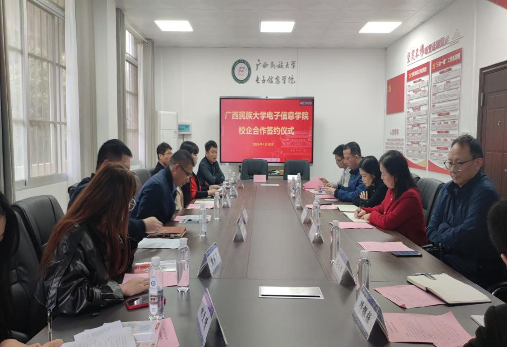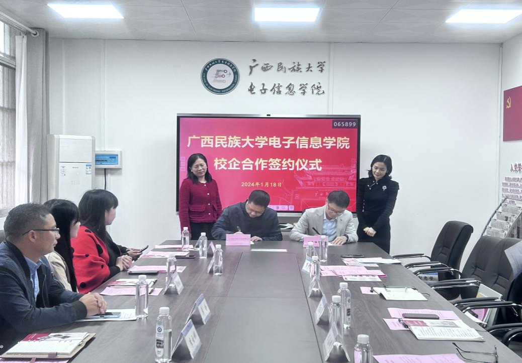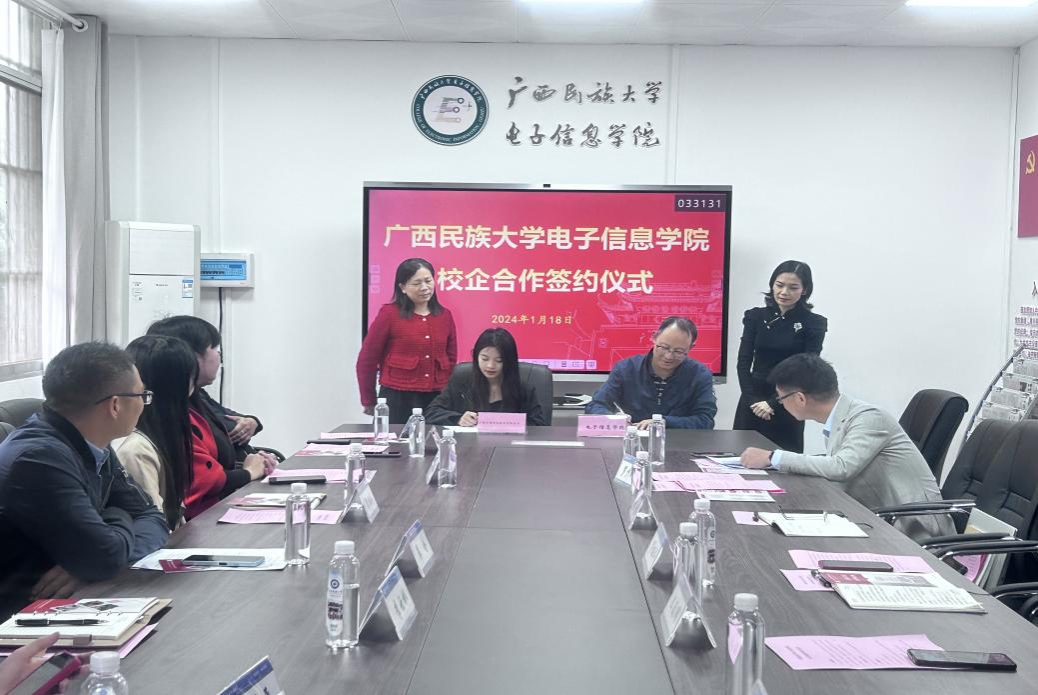 1月18日下午,电子信息公司与广西南宁齐鸣科技有限公司、广西艾学教育科技有限公司、广西新松机器人有限公司、广西万诺信息技术有限公司、南宁踏弩科技有限公司在博识楼300会议室举行校企合作签约仪式,电子信息公司党委书记张婧,党委副书记、经理罗丽平,党委副书记罗少科,副经理文春明、卢振坤,企业相关负责人出席校企合作签约仪式。