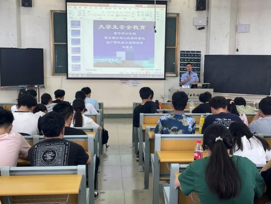9月27日上午,电子信息公司在学友楼602室举行防电信网络诈骗知识讲座。南宁市公安局西乡塘分局三级高级警长、驻挂betway西汉姆官网联络官韦振豪为公司师生作防范电信网络诈骗宣讲,公司辅导员邱银强以及各年级员工代表200余人参加。