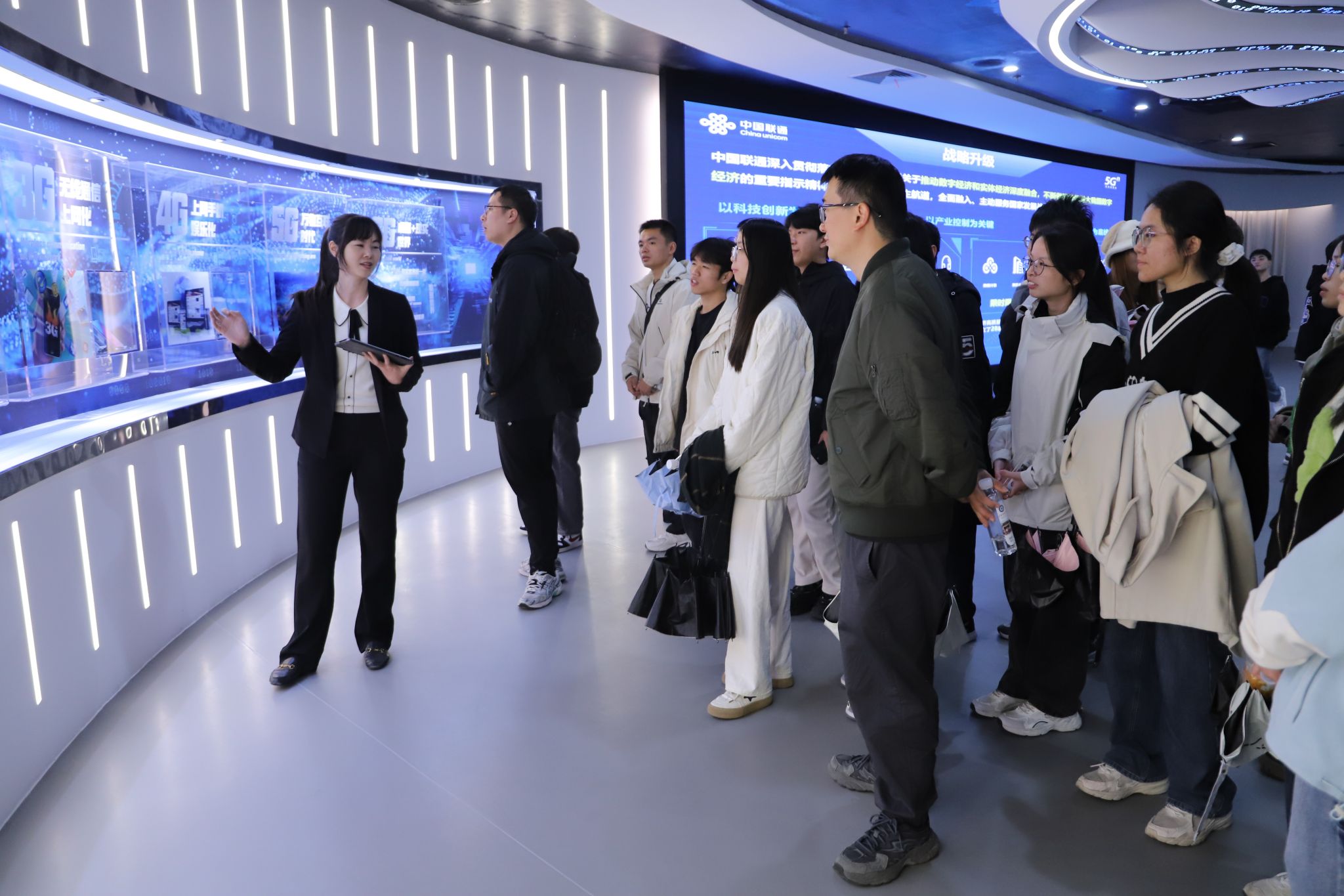 校园经理黄胜立对电子信息公司师生的到来表示欢迎,并带领着师生一行人前往中国联通智家实训室、中国联通东盟云数据中心、中国联通智慧展厅进行参观。