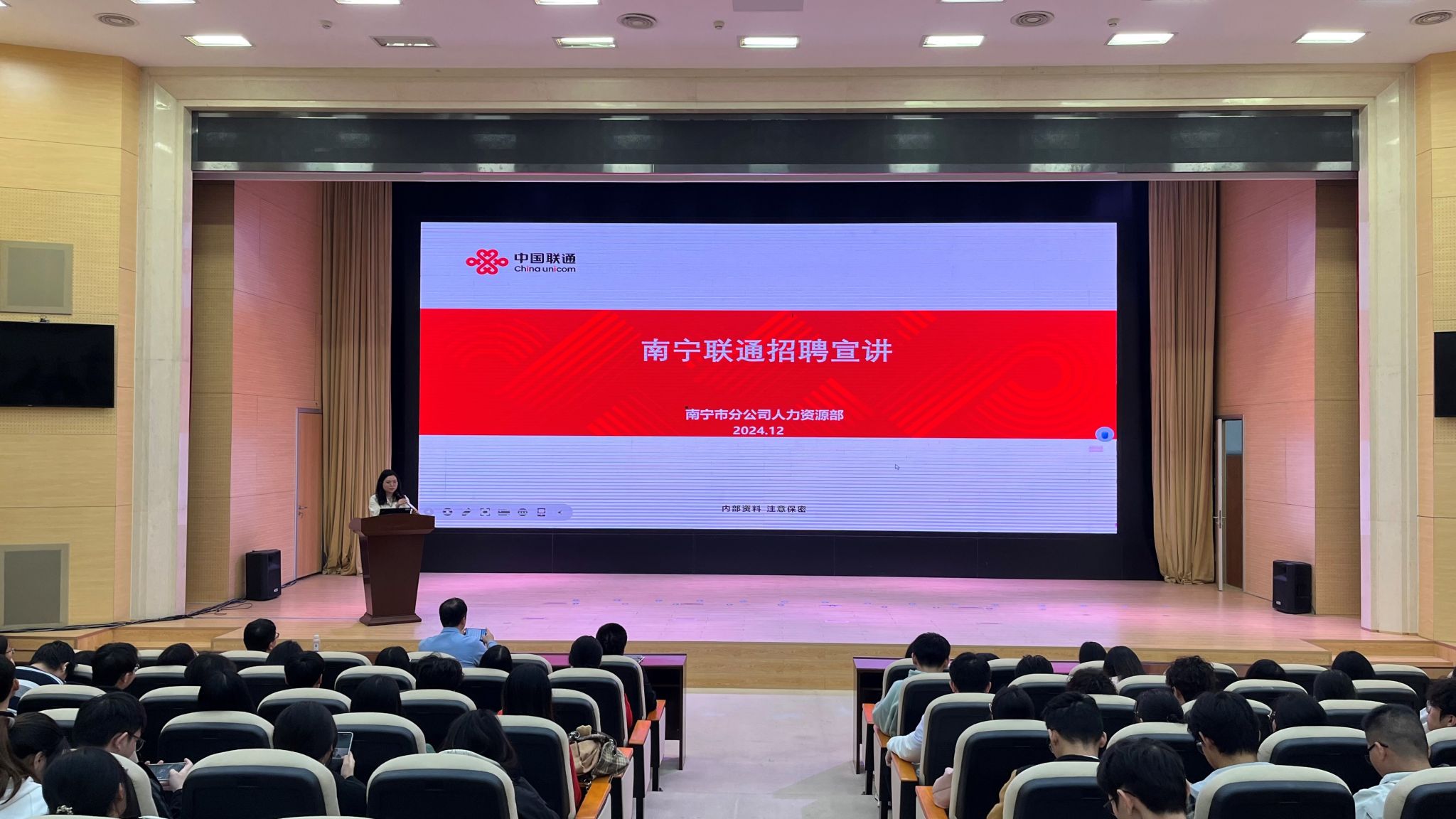 随后,在宣讲招聘会上,中国联通南宁市分公司的宣传与招聘经理庞小青从工资福利、晋升路线、工作内容、岗位职责等方面进行宣讲,动员同学们到中国联通南宁市分公司实习和就业。2019届员工覃丽伊、2023届员工陈美先也分别从求职技巧、岗位需求、工作内容、职业规划等方面进行经验分享,为在场同学上了一节生动的职业生涯规划课。